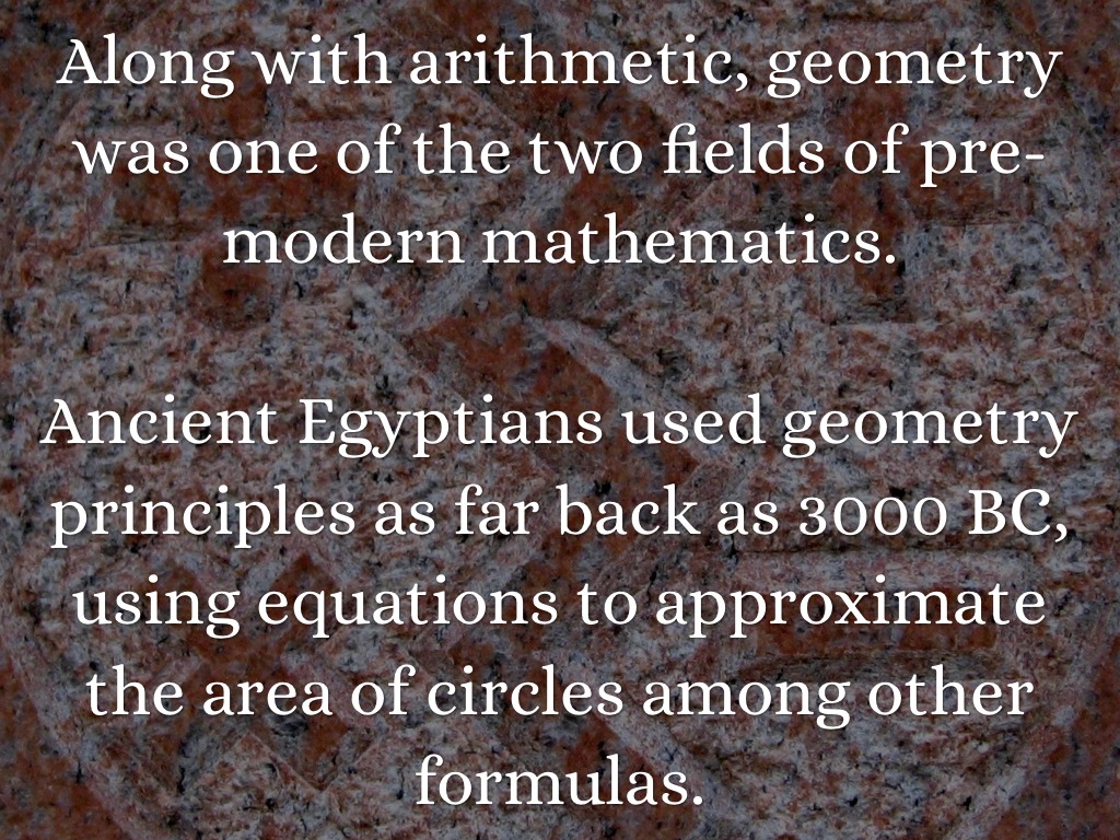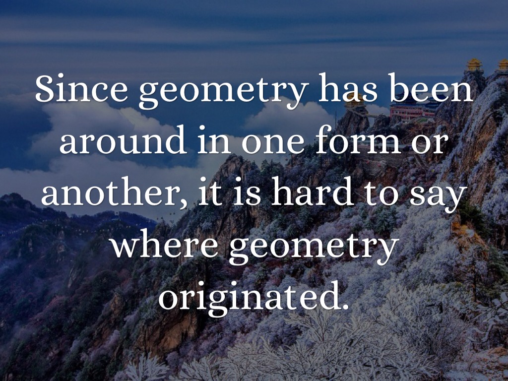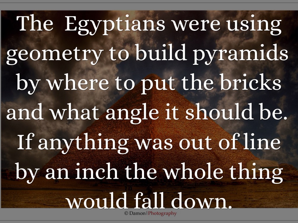The Egyptians were using geometry to build pyramids by where to put the bricks and what angle it should be. If anything was out of line by an inch the whole thing would fall down.