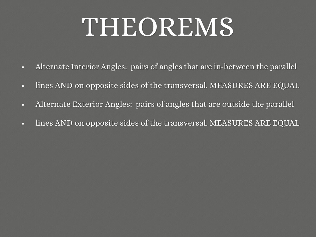- lines AND on opposite sides of the transversal. MEASURES ARE EQUAL