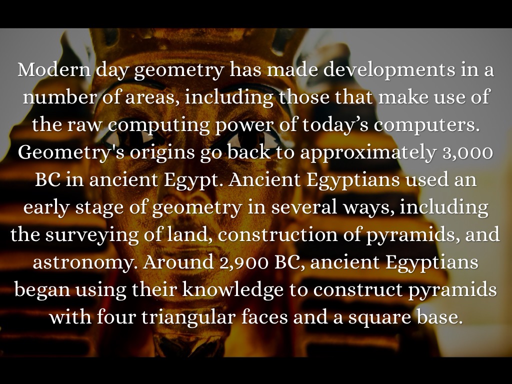 Modern day geometry has made developments in a number of areas, including those that make use of the raw computing power of today’s computers. Geometry's origins go back to approximately 3,000 BC in ancient Egypt. Ancient Egyptians used an early stage of geometry in several ways, including the surveying of land, construction of pyramids, and astronomy. Around 2,900 BC, ancient Egyptians began using their knowledge to construct pyramids with four triangular faces and a square base.