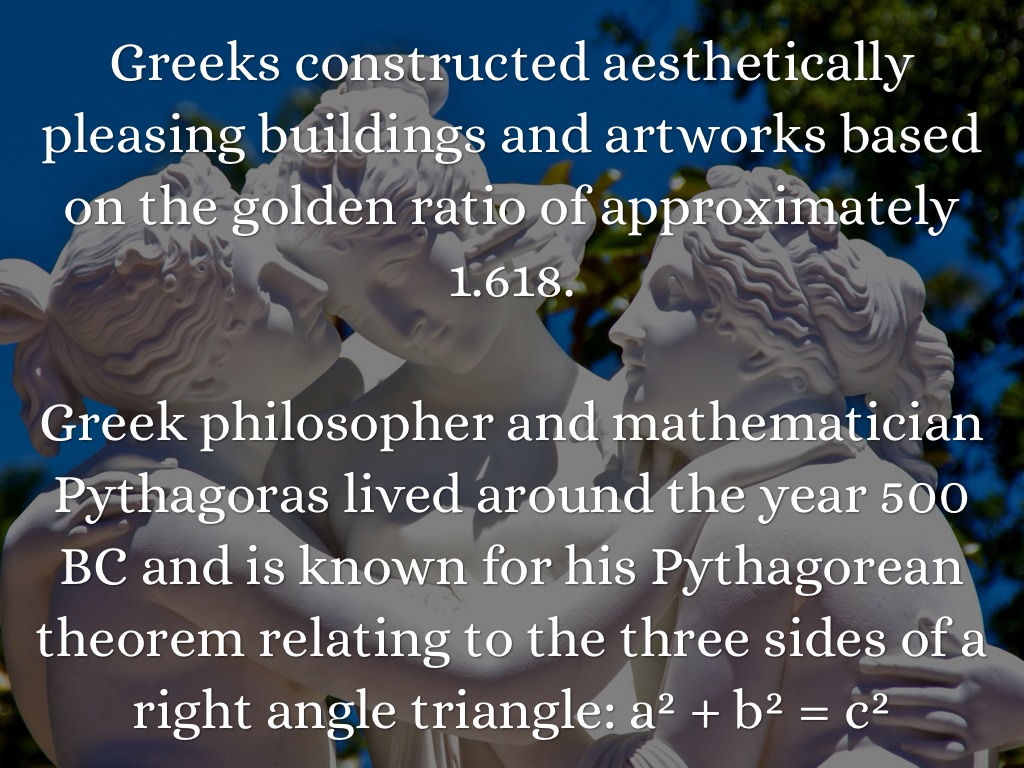 Greeks constructed aesthetically pleasing buildings and artworks based on the golden ratio of approximately 1.618.