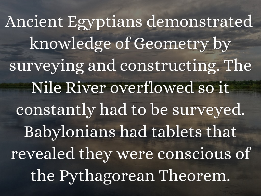 Ancient Egyptians demonstrated knowledge of Geometry by surveying and constructing. The Nile River overflowed so it constantly had to be surveyed. Babylonians had tablets that revealed they were conscious of the Pythagorean Theorem.