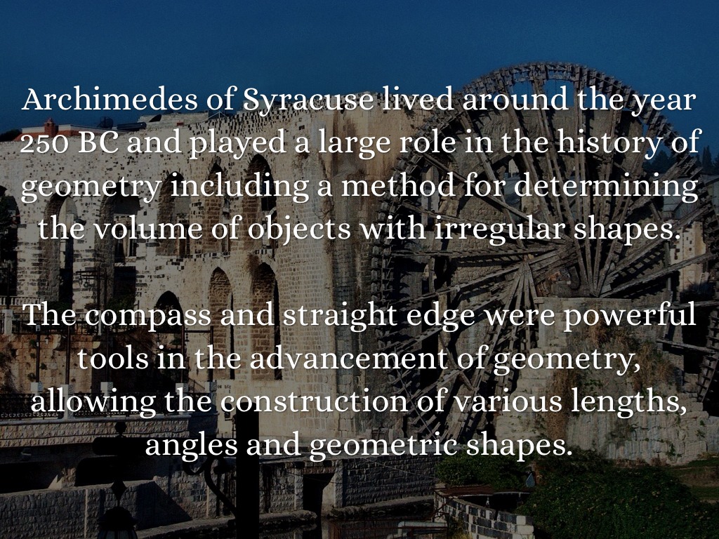 Archimedes of Syracuse lived around the year 250 BC and played a large role in the history of geometry including a method for determining the volume of objects with irregular shapes.