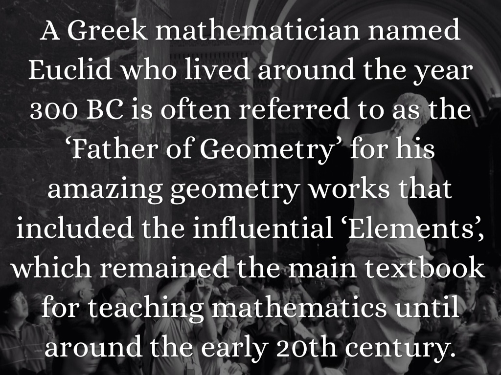 A Greek mathematician named Euclid who lived around the year 300 BC is often referred to as the ‘Father of Geometry’ for his amazing geometry works that included the influential ‘Elements’, which remained the main textbook for teaching mathematics until around the early 20th century.