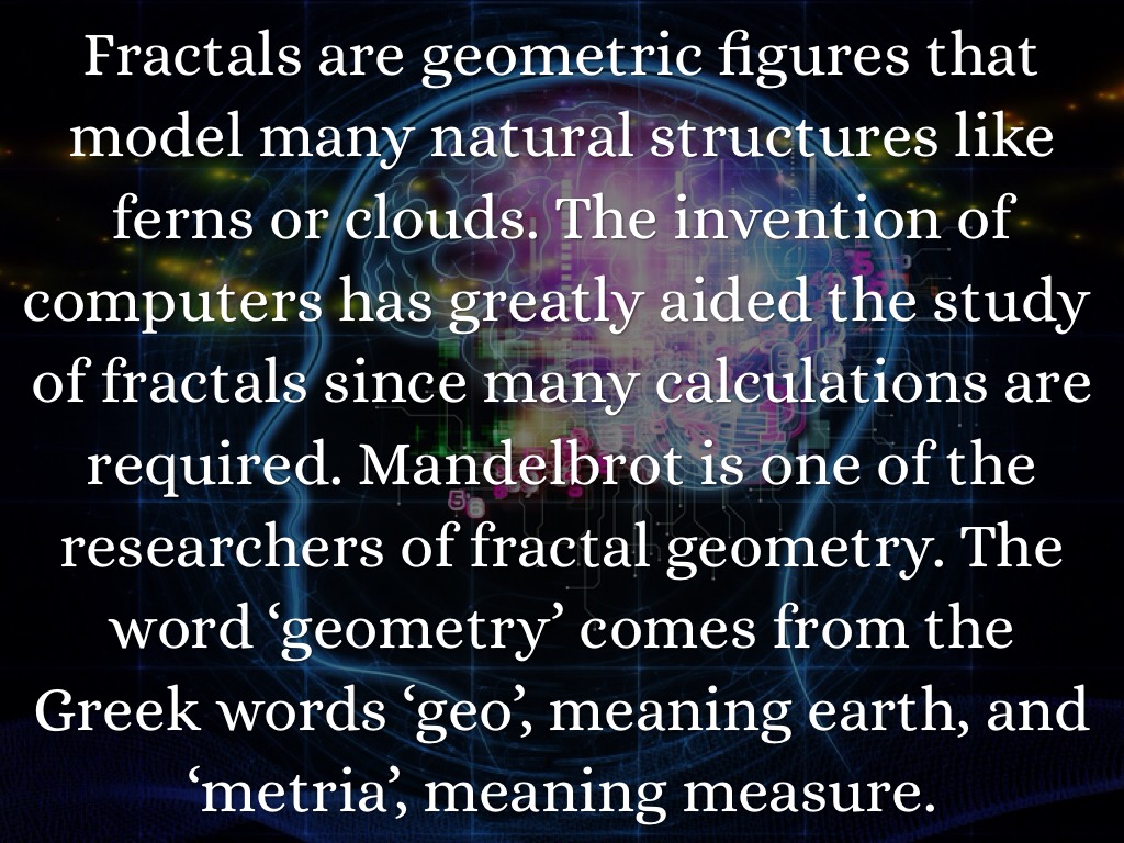Fractals are geometric figures that model many natural structures like ferns or clouds. The invention of computers has greatly aided the study of fractals since many calculations are required. Mandelbrot is one of the researchers of fractal geometry. The word ‘geometry’ comes from the Greek words ‘geo’, meaning earth, and ‘metria’, meaning measure.