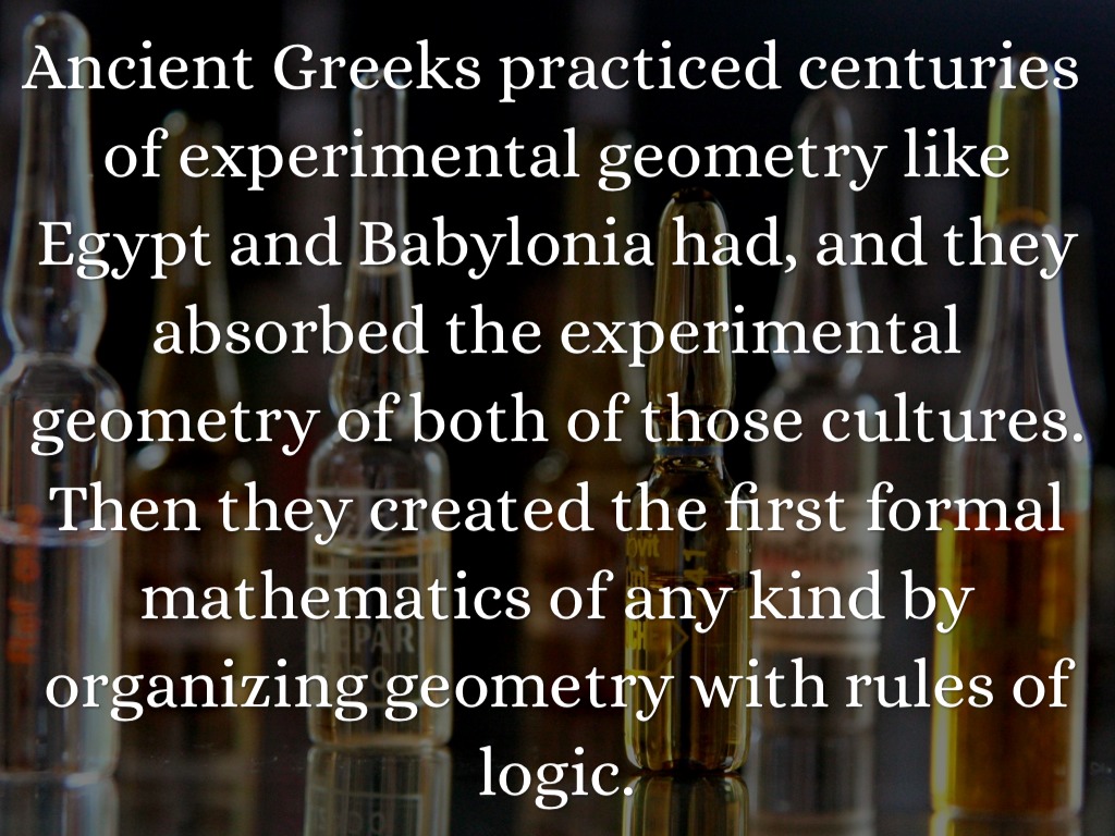 Ancient Greeks practiced centuries of experimental geometry like Egypt and Babylonia had, and they absorbed the experimental geometry of both of those cultures. Then they created the first formal mathematics of any kind by organizing geometry with rules of logic.