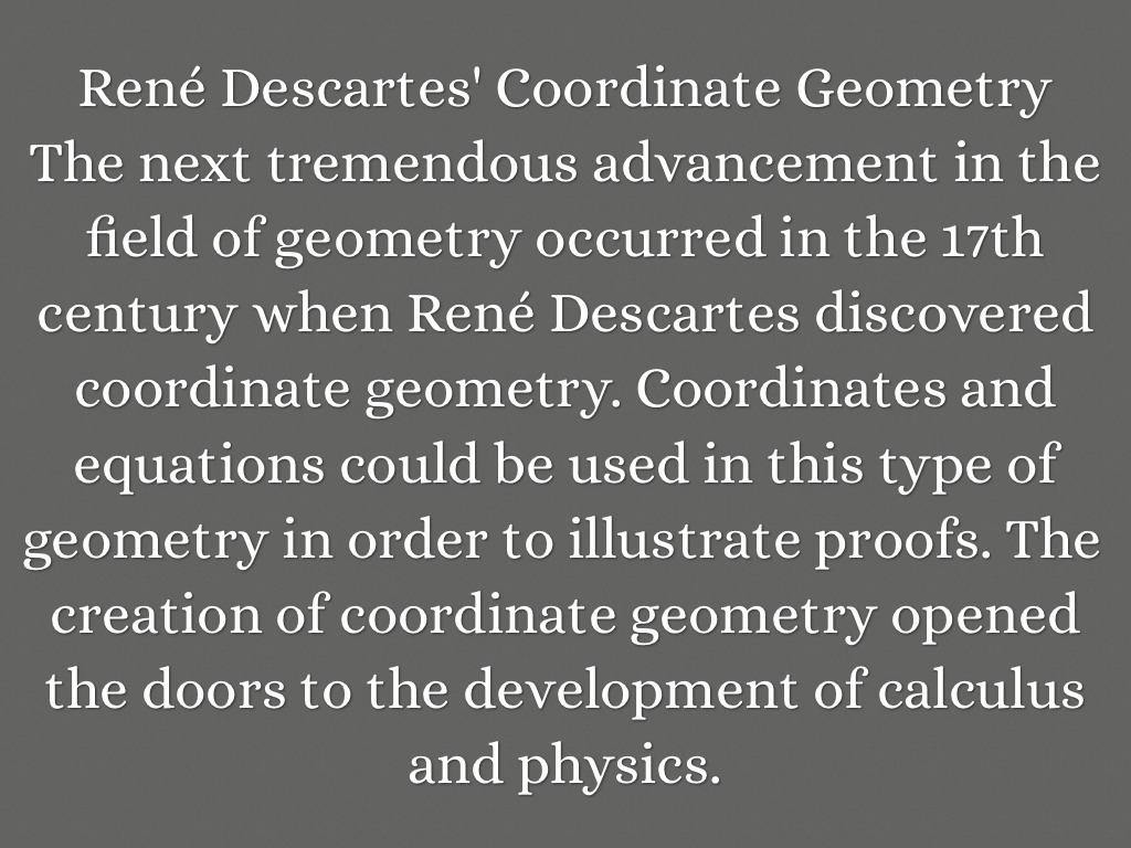 The next tremendous advancement in the field of geometry occurred in the 17th century when René Descartes discovered coordinate geometry. Coordinates and equations could be used in this type of geometry in order to illustrate proofs. The creation of coordinate geometry opened the doors to the development of calculus and physics.