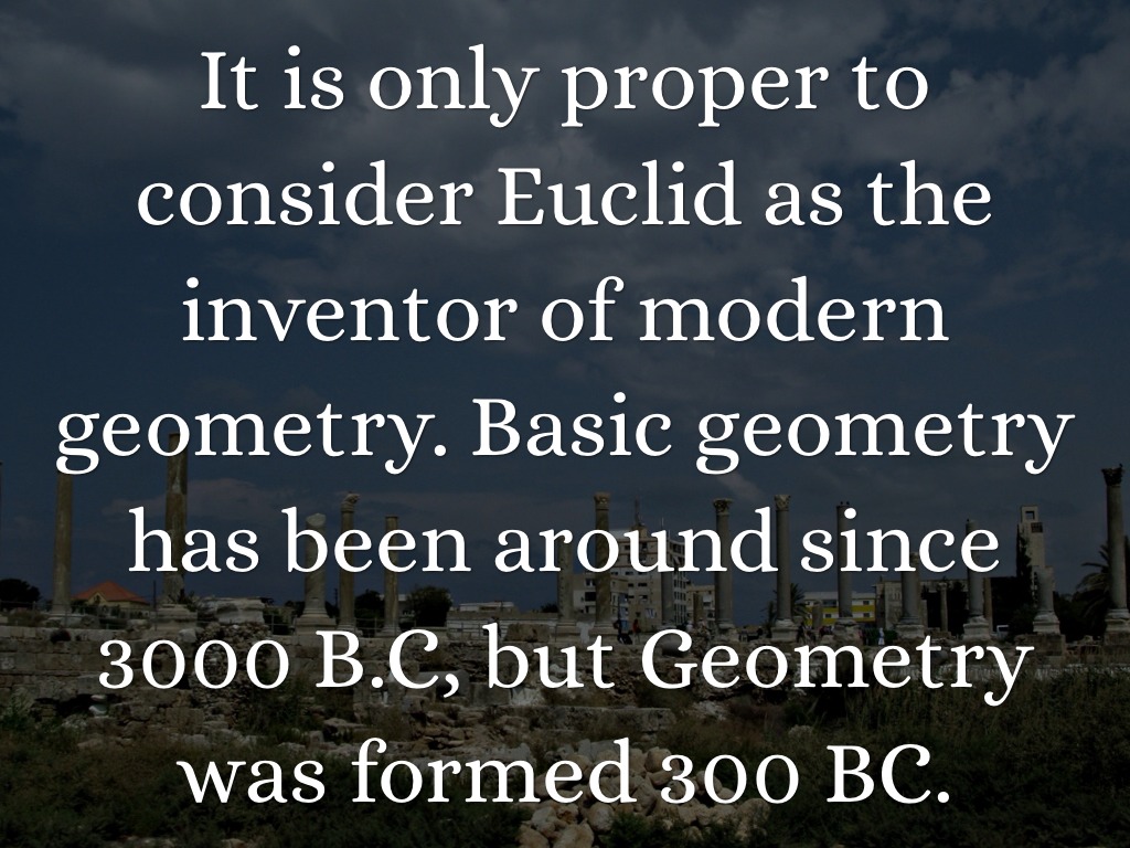 It is only proper to consider Euclid as the inventor of modern geometry. Basic geometry has been around since 3000 B.C, but Geometry was formed 300 BC.