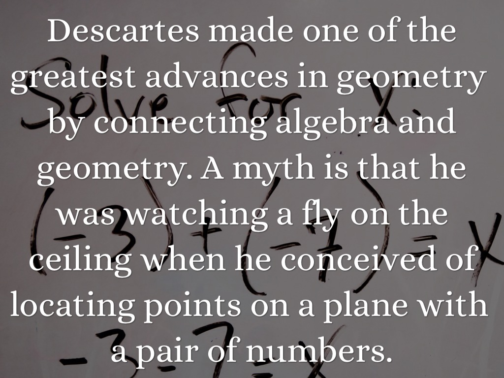 Descartes made one of the greatest advances in geometry by connecting algebra and geometry. A myth is that he was watching a fly on the ceiling when he conceived of locating points on a plane with a pair of numbers.