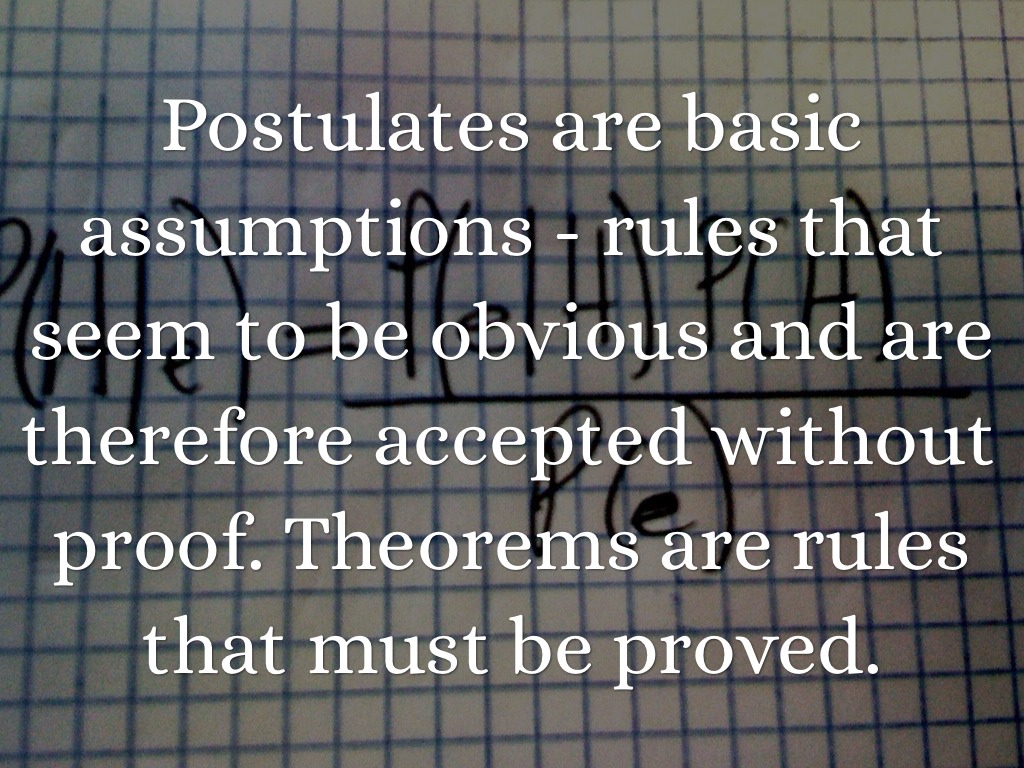 Postulates are basic assumptions - rules that seem to be obvious and are therefore accepted without proof. Theorems are rules that must be proved.