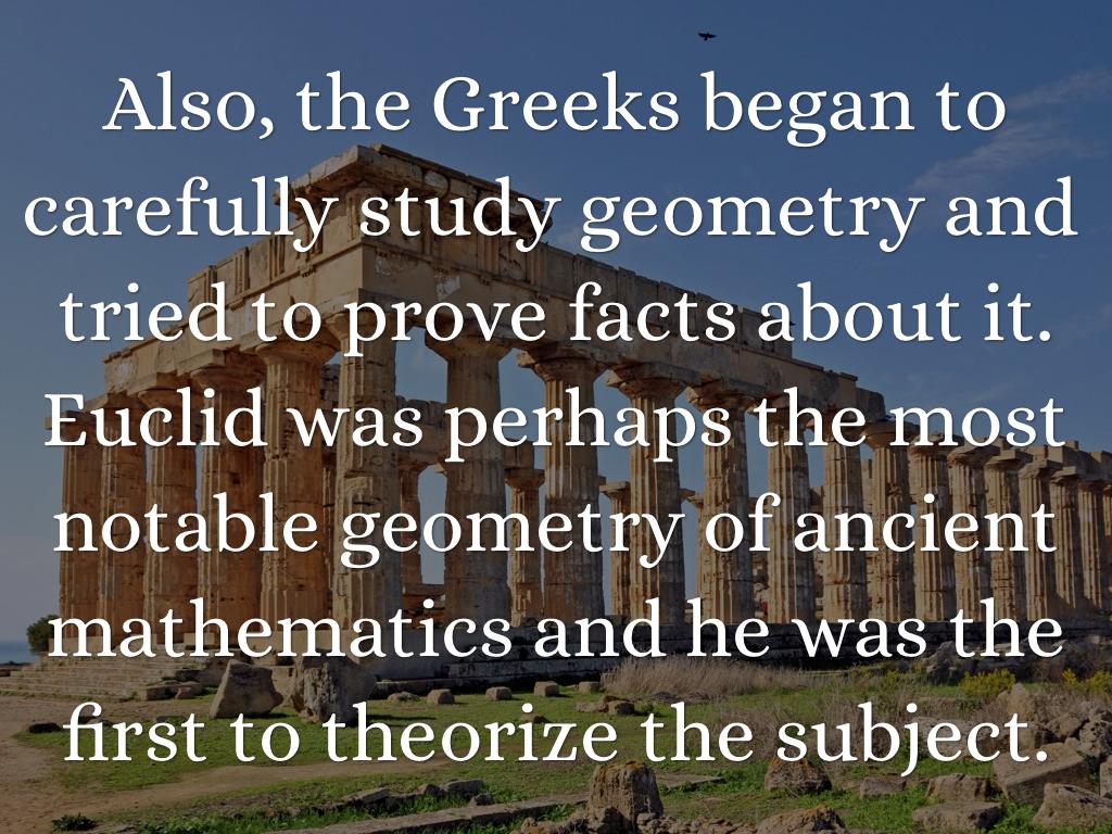 Also, the Greeks began to carefully study geometry and tried to prove facts about it. Euclid was perhaps the most notable geometry of ancient mathematics and he was the first to theorize the subject.