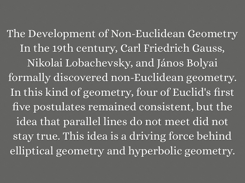In the 19th century, Carl Friedrich Gauss, Nikolai Lobachevsky, and János Bolyai formally discovered non-Euclidean geometry. In this kind of geometry, four of Euclid's first five postulates remained consistent, but the idea that parallel lines do not meet did not stay true. This idea is a driving force behind elliptical geometry and hyperbolic geometry.