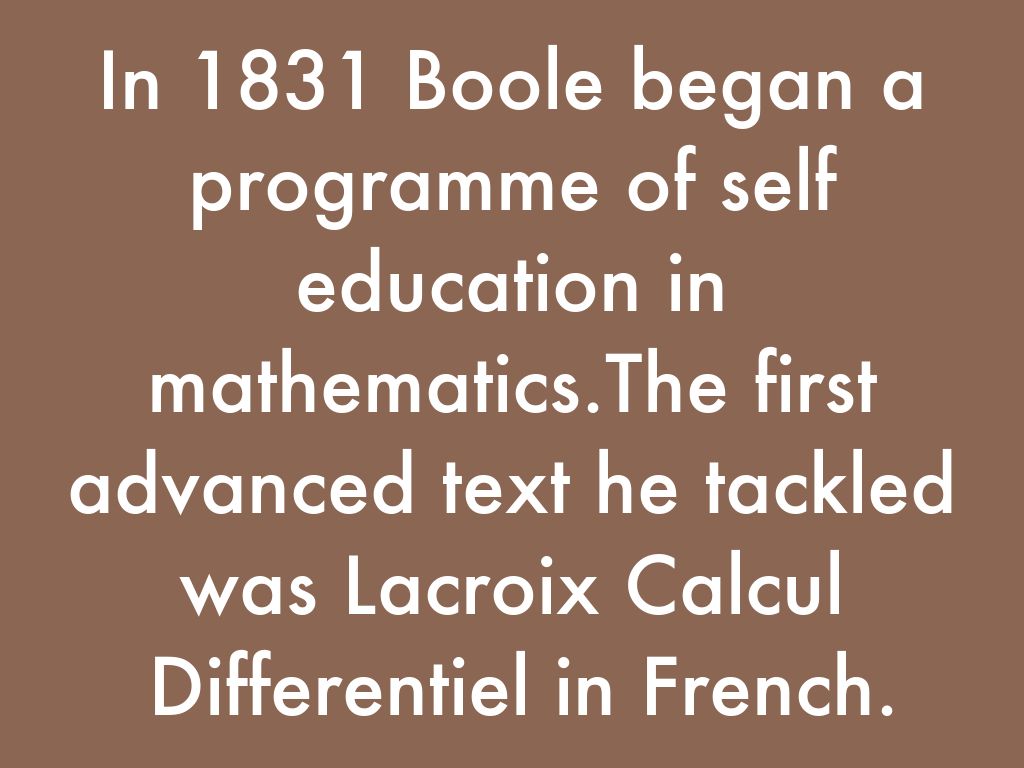 In 1831 Boole began a programme of self education in mathematics.The first advanced text he tackled was Lacroix Calcul Differentiel in French.