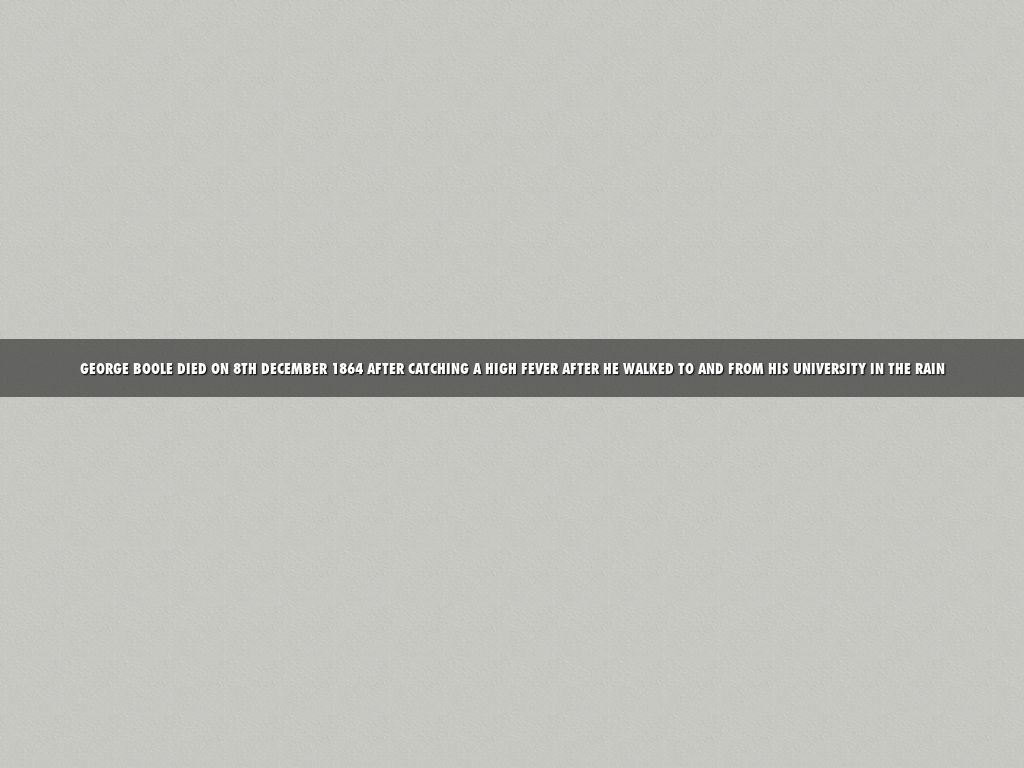 GEORGE BOOLE DIED ON 8TH DECEMBER 1864 AFTER CATCHING A HIGH FEVER AFTER HE WALKED TO AND FROM HIS UNIVERSITY IN THE RAIN