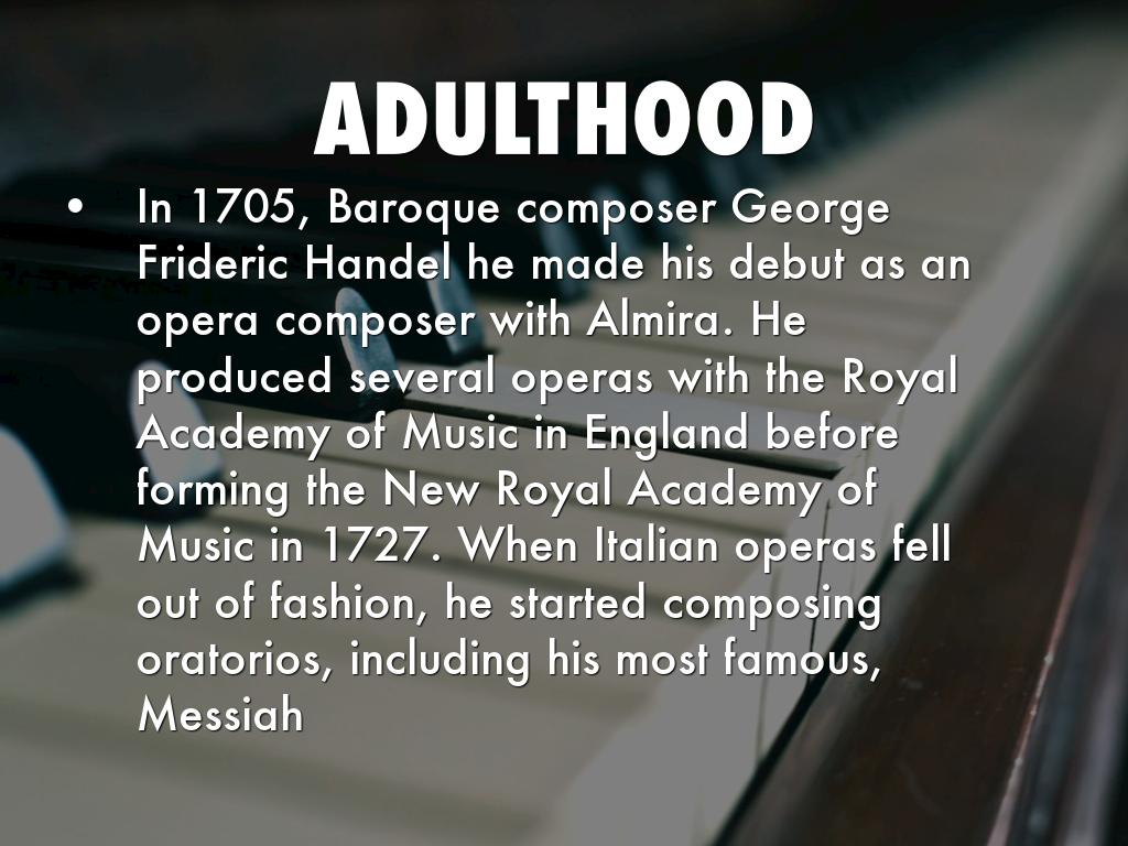 In 1705, Baroque composer George Frideric Handel he made his debut as an opera composer with Almira. He produced several operas with the Royal Academy of Music in England before forming the New Royal Academy of Music in 1727. When Italian operas fell out of fashion, he started composing oratorios, including his most famous, Messiah