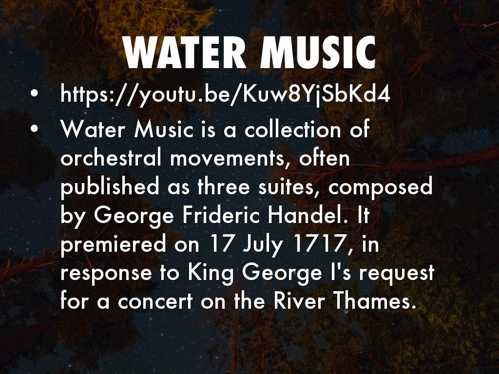 Water Music is a collection of orchestral movements, often published as three suites, composed by George Frideric Handel. It premiered on 17 July 1717, in response to King George I's request for a concert on the River Thames.