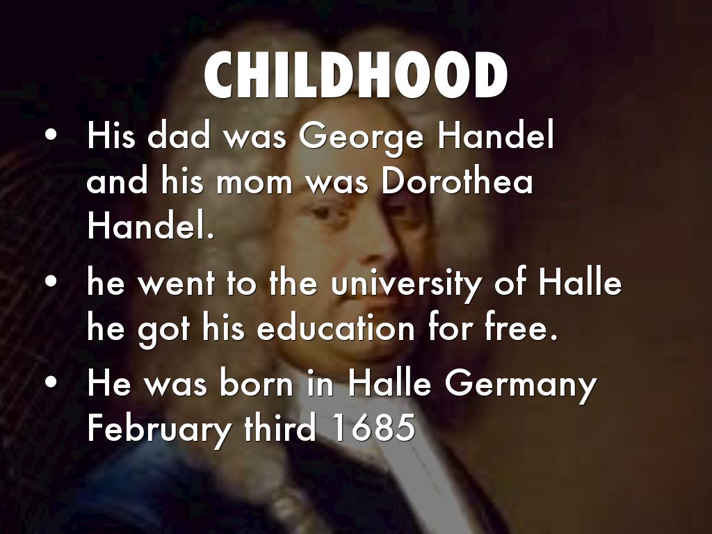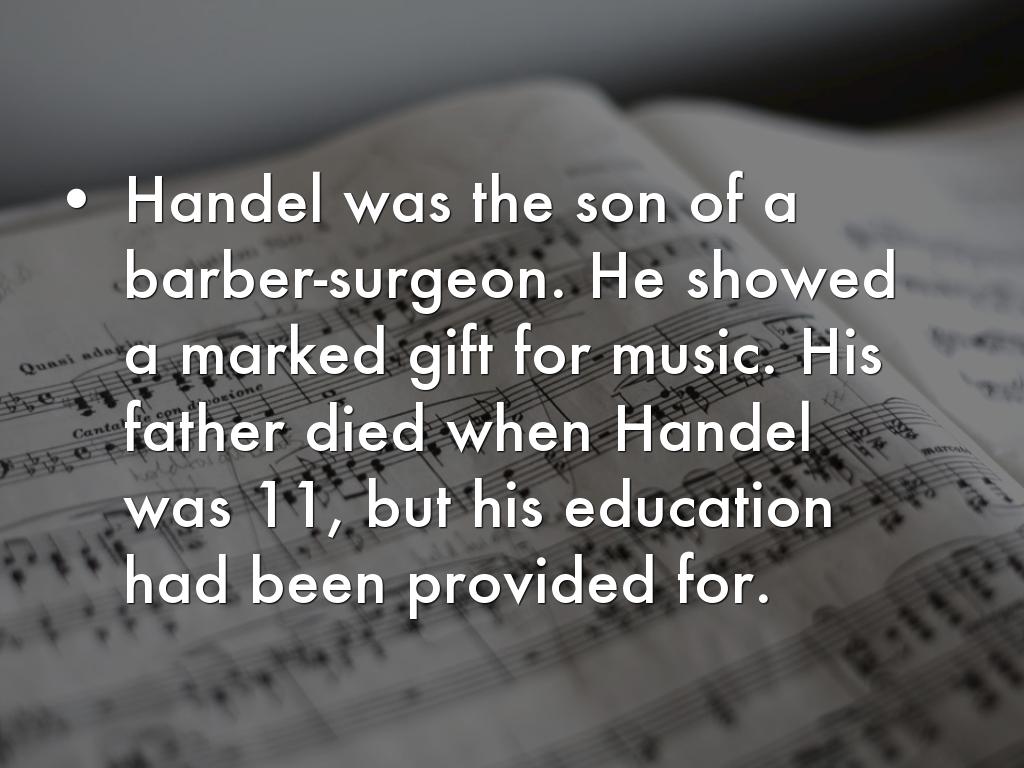 Handel was the son of a barber-surgeon. He showed a marked gift for music. His father died when Handel was 11, but his education had been provided for.