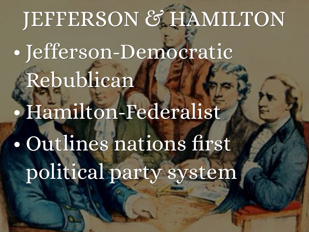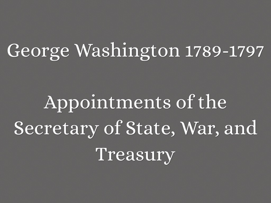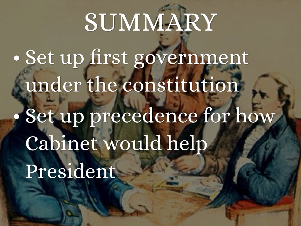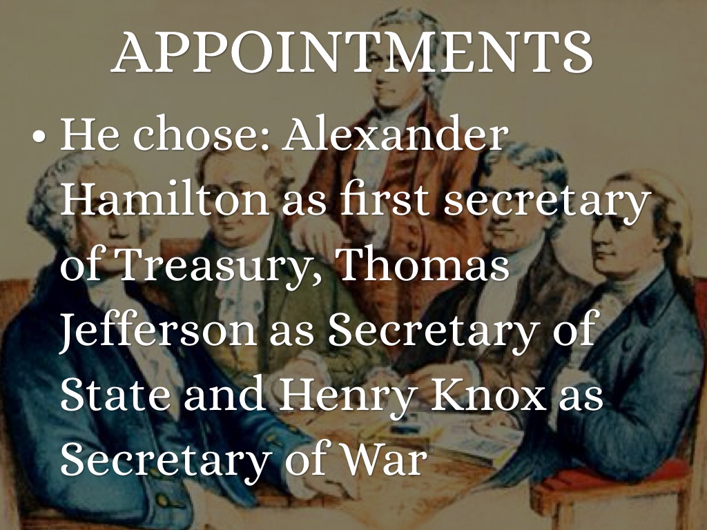 • He chose: Alexander Hamilton as first secretary of Treasury, Thomas Jefferson as Secretary of State and Henry Knox as Secretary of War