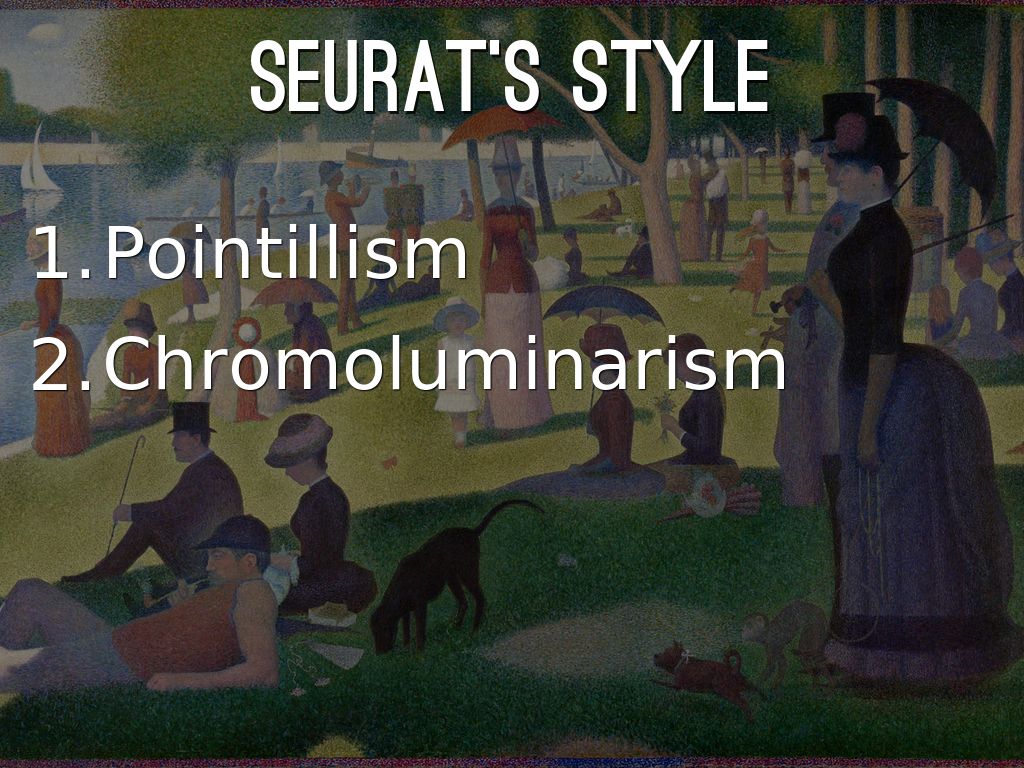 Motivated by study in optical and color theory, Seurat contrasted miniature dots or small brushstrokes of colors that when unified optically in the human eye were perceived as a single shade or hue. He believed that this form of painting, called divisionism at the time but now known as pointillism, would make the colors more brilliant and powerful than standard brush strokes. The use of dots of almost uniform size came in the second year of his work on the painting, 1885–86. To make the experience of the painting even more vivid, he surrounded it with a frame of painted dots, which in turn he enclosed with a pure white, wooden frame, which is how the painting is exhibited today at the Art Institute of Chicago.