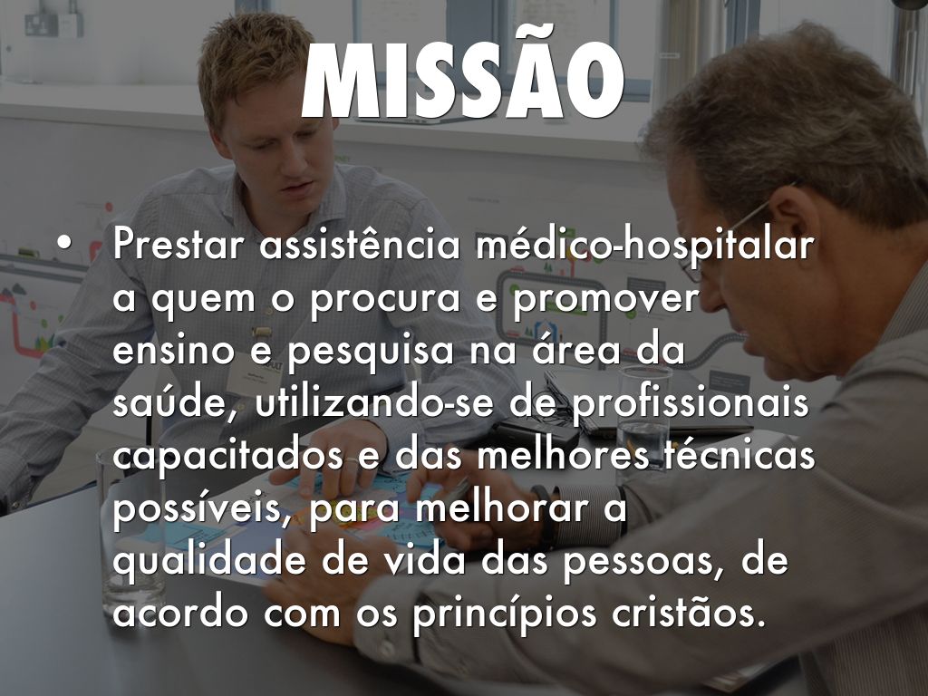 Prestar assistência médico-hospitalar a quem o procura e promover ensino e pesquisa na área da saúde, utilizando-se de profissionais capacitados e das melhores técnicas possíveis, para melhorar a qualidade de vida das pessoas, de acordo com os princípios cristãos.