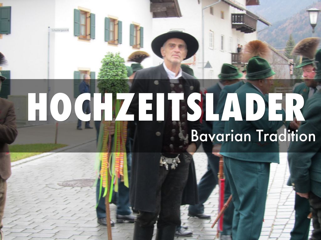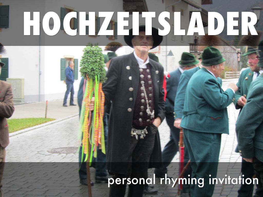 This Bavarian tradition has an official inviter clad in fancy clothes decorated with ribbons and flowers going door to door extending a personal rhyming invitation to the invited guests. Guests accept by pinning one of the ribbons to the Hochzeitslader hat and by offering a drink or two at each stop. Should the invited guests be numerous and the Hochzeitslader be of the nature to accept the offered drinks he may need a day or two to complete his duties!