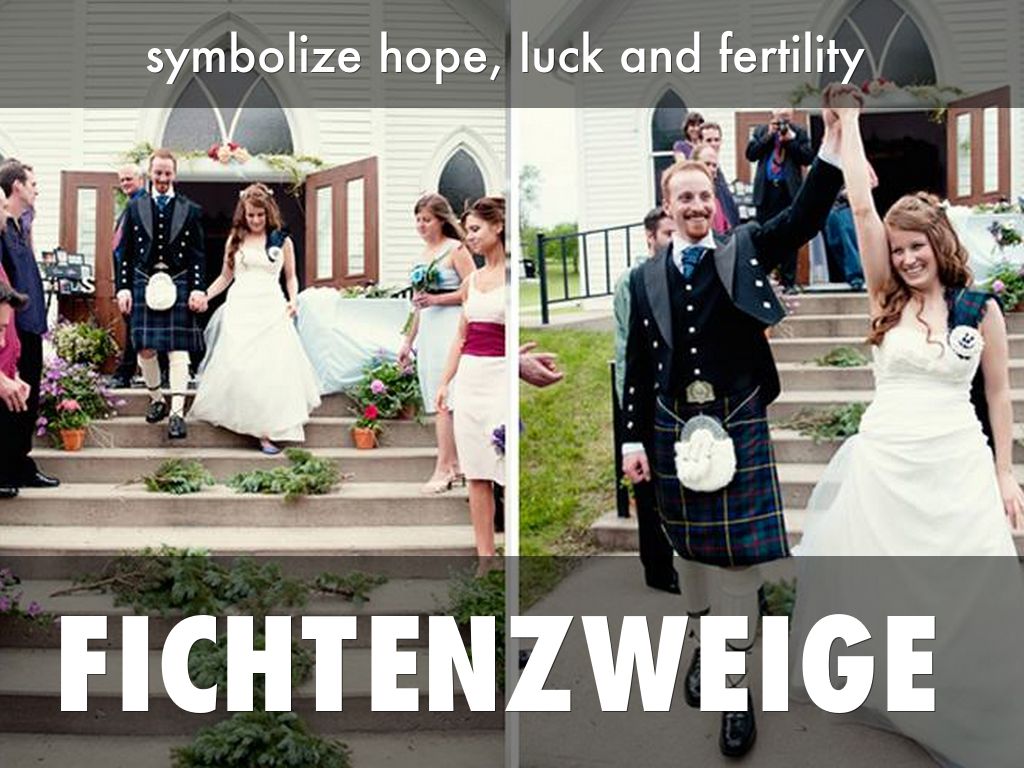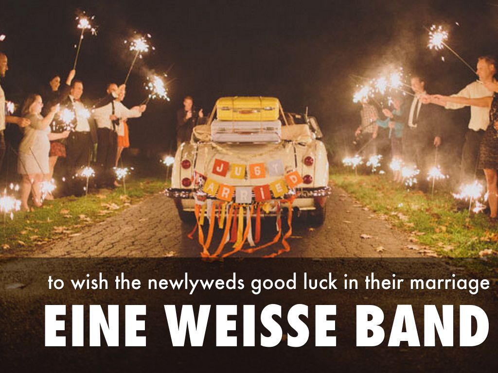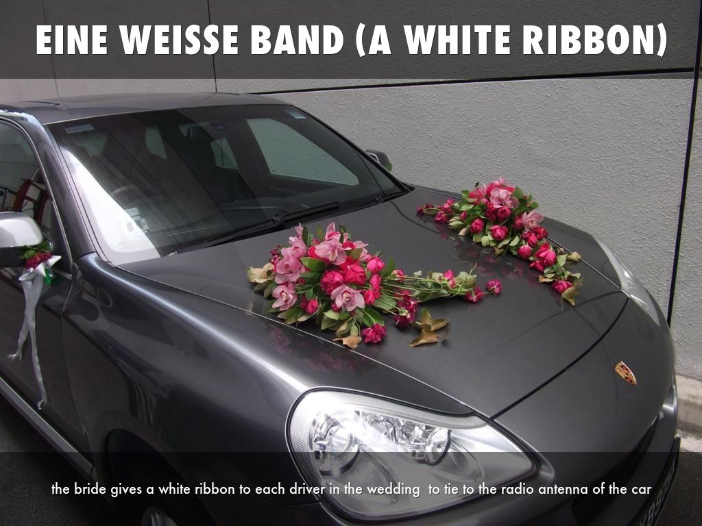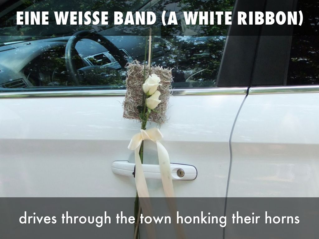 As the guests leave the church the bride gives a white ribbon to each driver of a car in the procession to tie to the radio antenna of the car. This procession then drives through the town honking their horns. Other drivers on the route honk their horns in return to wish the newlyweds good luck in their marriage. Eine Weisse Band (A white ribbon)