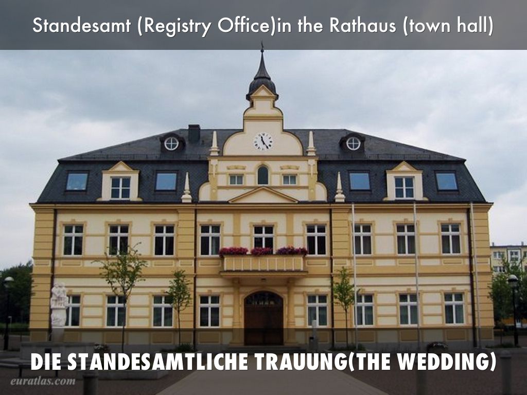 Die Standesamtliche Trauung(The Wedding) Standesamt (Registry Office)in the Rathaus (town hall) A witness is needed for the bride and also for the groom.