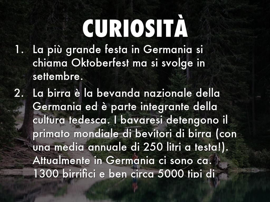 La birra è la bevanda nazionale della Germania ed è parte integrante della cultura tedesca. I bavaresi detengono il primato mondiale di bevitori di birra (con una media annuale di 250 litri a testa!).