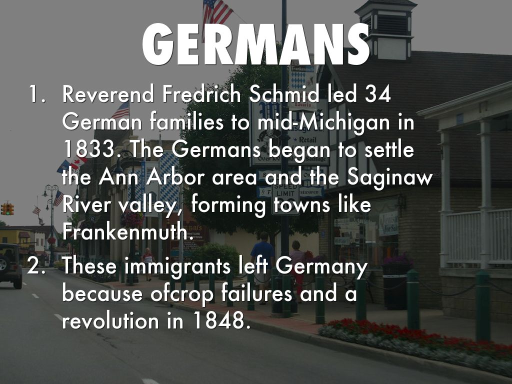 Reverend Fredrich Schmid led 34 German families to mid-Michigan in 1833. The Germans began to settle the Ann Arbor area and the Saginaw River valley, forming towns like Frankenmuth.