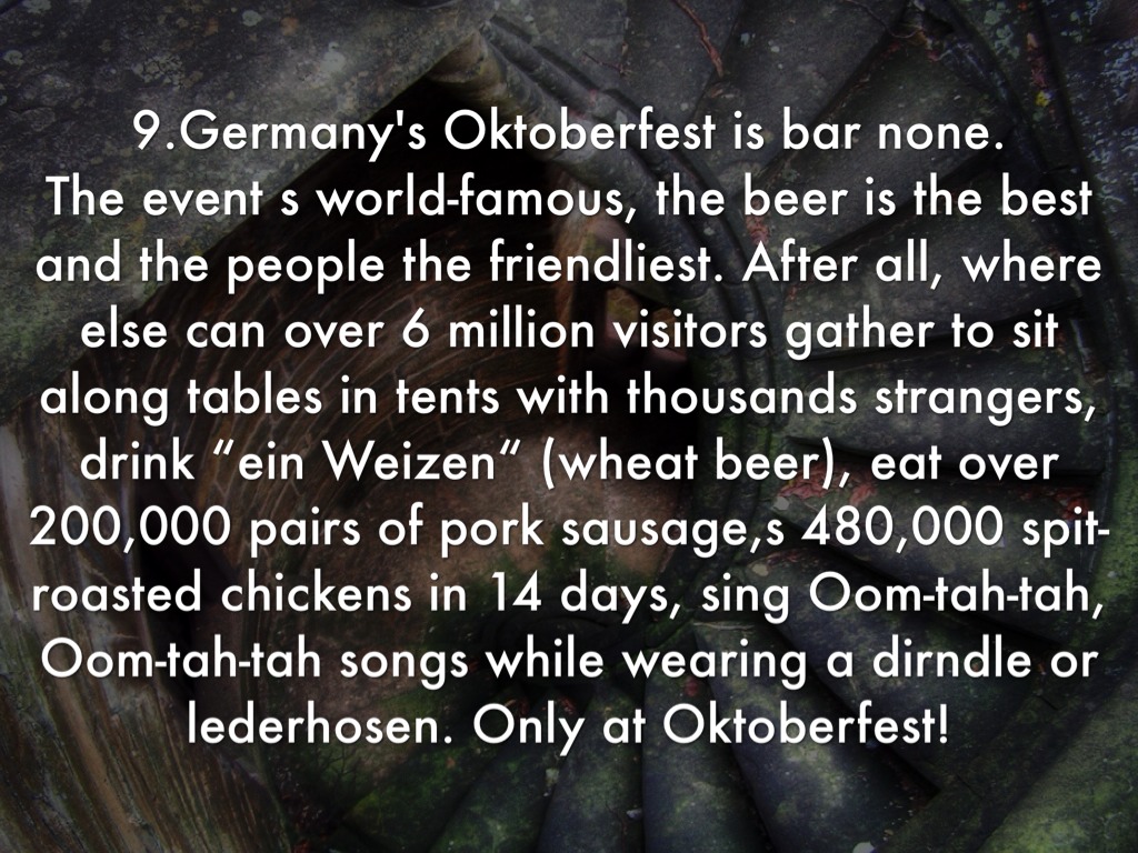 9.Germany's Oktoberfest is bar none. The event s world-famous, the beer is the best and the people the friendliest. After all, where else can over 6 million visitors gather to sit along tables in tents with thousands strangers, drink “ein Weizen“ (wheat beer), eat over 200,000 pairs of pork sausage,s 480,000 spit-roasted chickens in 14 days, sing Oom-tah-tah, Oom-tah-tah songs while wearing a dirndle or lederhosen. Only at Oktoberfest!