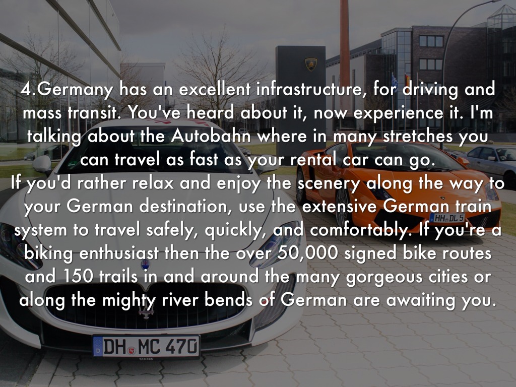 4.Germany has an excellent infrastructure, for driving and mass transit. You've heard about it, now experience it. I'm talking about the Autobahn where in many stretches you can travel as fast as your rental car can go. If you'd rather relax and enjoy the scenery along the way to your German destination, use the extensive German train system to travel safely, quickly, and comfortably. If you're a biking enthusiast then the over 50,000 signed bike routes and 150 trails in and around the many gorgeous cities or along the mighty river bends of German are awaiting you.