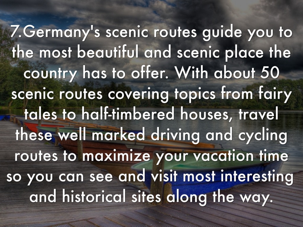 7.Germany's scenic routes guide you to the most beautiful and scenic place the country has to offer. With about 50 scenic routes covering topics from fairy tales to half-timbered houses, travel these well marked driving and cycling routes to maximize your vacation time so you can see and visit most interesting and historical sites along the way.