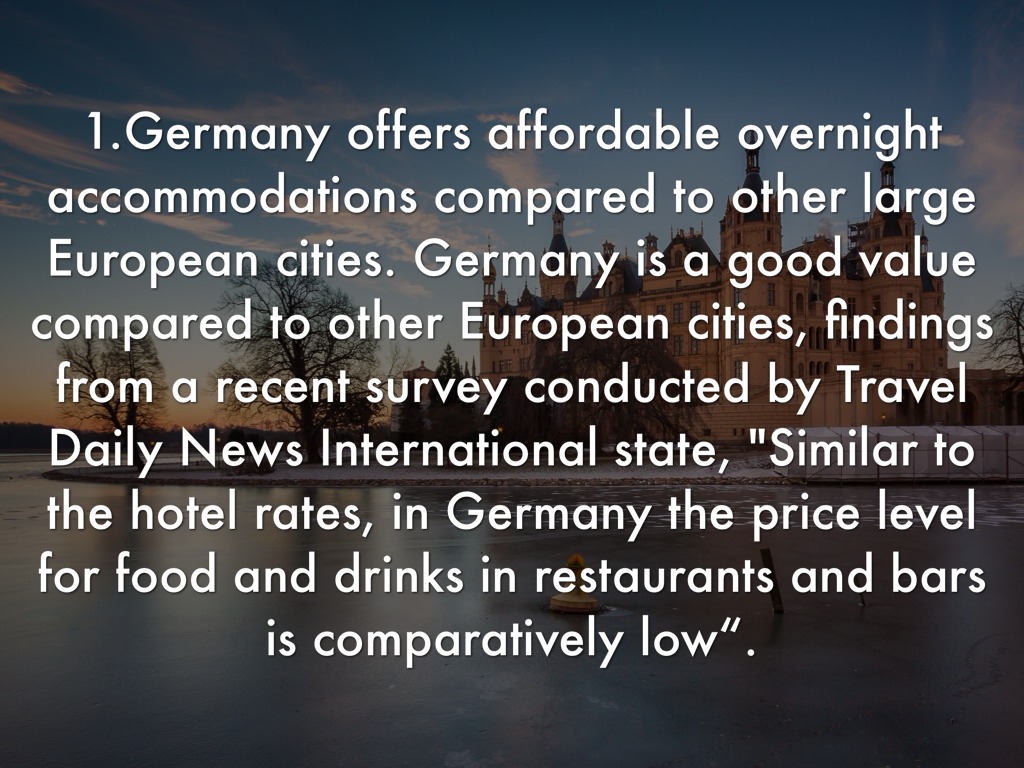 1.Germany offers affordable overnight accommodations compared to other large European cities. Germany is a good value compared to other European cities, findings from a recent survey conducted by Travel Daily News International state, "Similar to the hotel rates, in Germany the price level for food and drinks in restaurants and bars is comparatively low“.