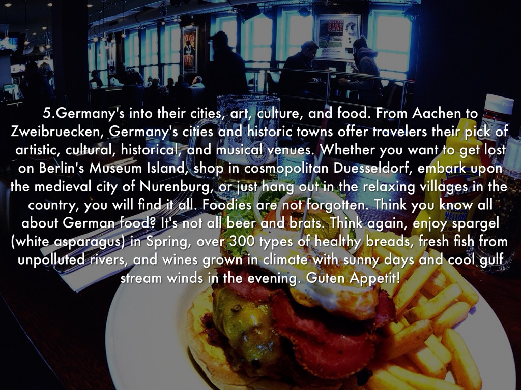 5.Germany's into their cities, art, culture, and food. From Aachen to Zweibruecken, Germany's cities and historic towns offer travelers their pick of artistic, cultural, historical, and musical venues. Whether you want to get lost on Berlin's Museum Island, shop in cosmopolitan Duesseldorf, embark upon the medieval city of Nurenburg, or just hang out in the relaxing villages in the country, you will find it all. Foodies are not forgotten. Think you know all about German food? It's not all beer and brats. Think again, enjoy spargel (white asparagus) in Spring, over 300 types of healthy breads, fresh fish from unpolluted rivers, and wines grown in climate with sunny days and cool gulf stream winds in the evening. Guten Appetit!