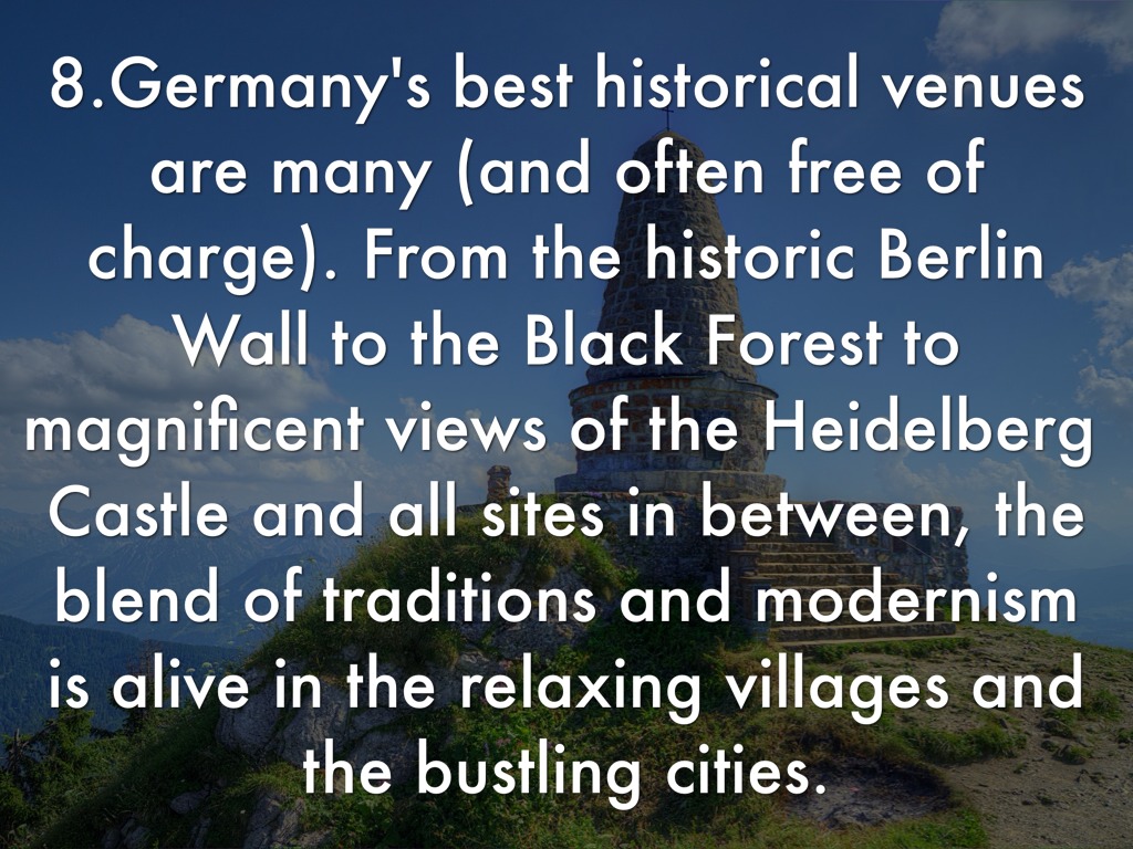 8.Germany's best historical venues are many (and often free of charge). From the historic Berlin Wall to the Black Forest to magnificent views of the Heidelberg Castle and all sites in between, the blend of traditions and modernism is alive in the relaxing villages and the bustling cities.