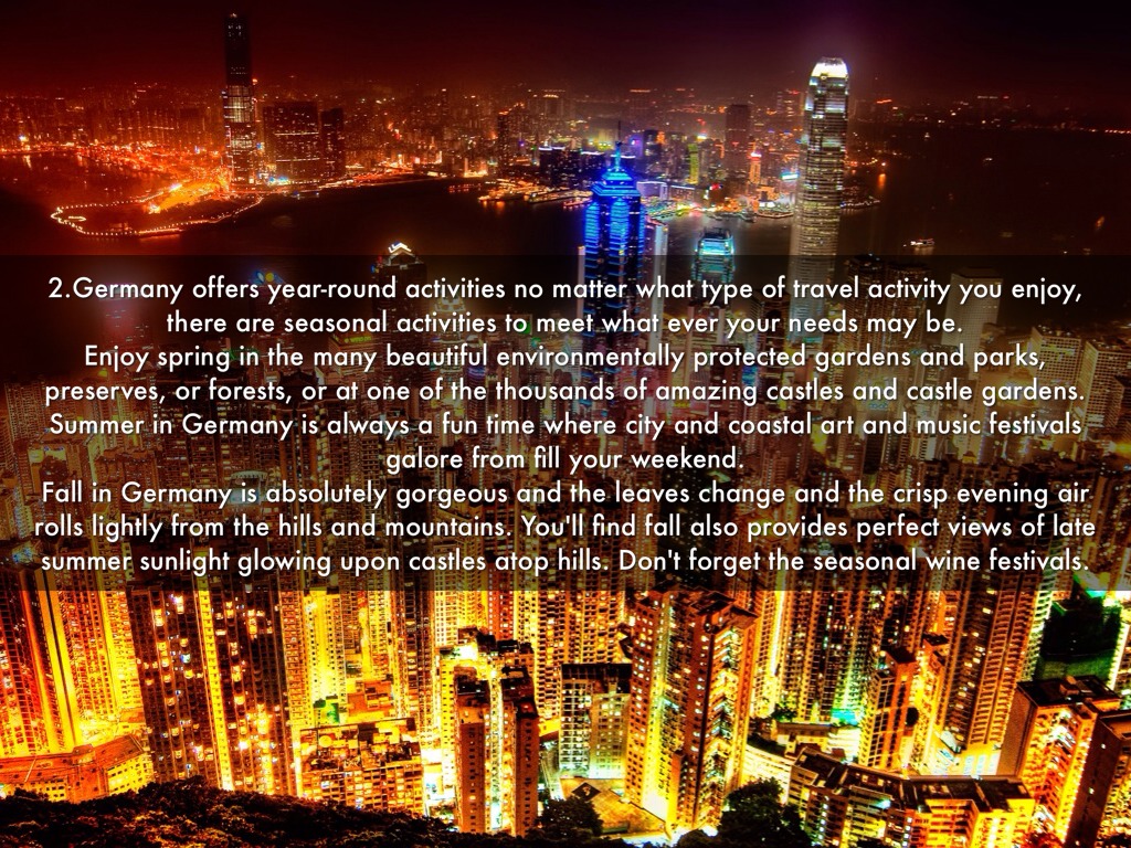 2.Germany offers year-round activities no matter what type of travel activity you enjoy, there are seasonal activities to meet what ever your needs may be. Enjoy spring in the many beautiful environmentally protected gardens and parks, preserves, or forests, or at one of the thousands of amazing castles and castle gardens. Summer in Germany is always a fun time where city and coastal art and music festivals galore from fill your weekend. Fall in Germany is absolutely gorgeous and the leaves change and the crisp evening air rolls lightly from the hills and mountains. You'll find fall also provides perfect views of late summer sunlight glowing upon castles atop hills. Don't forget the seasonal wine festivals.