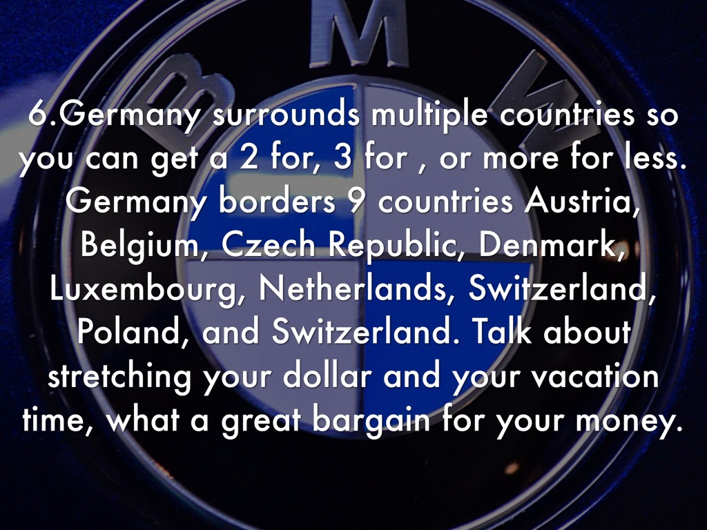 6.Germany surrounds multiple countries so you can get a 2 for, 3 for , or more for less. Germany borders 9 countries Austria, Belgium, Czech Republic, Denmark, Luxembourg, Netherlands, Switzerland, Poland, and Switzerland. Talk about stretching your dollar and your vacation time, what a great bargain for your money.