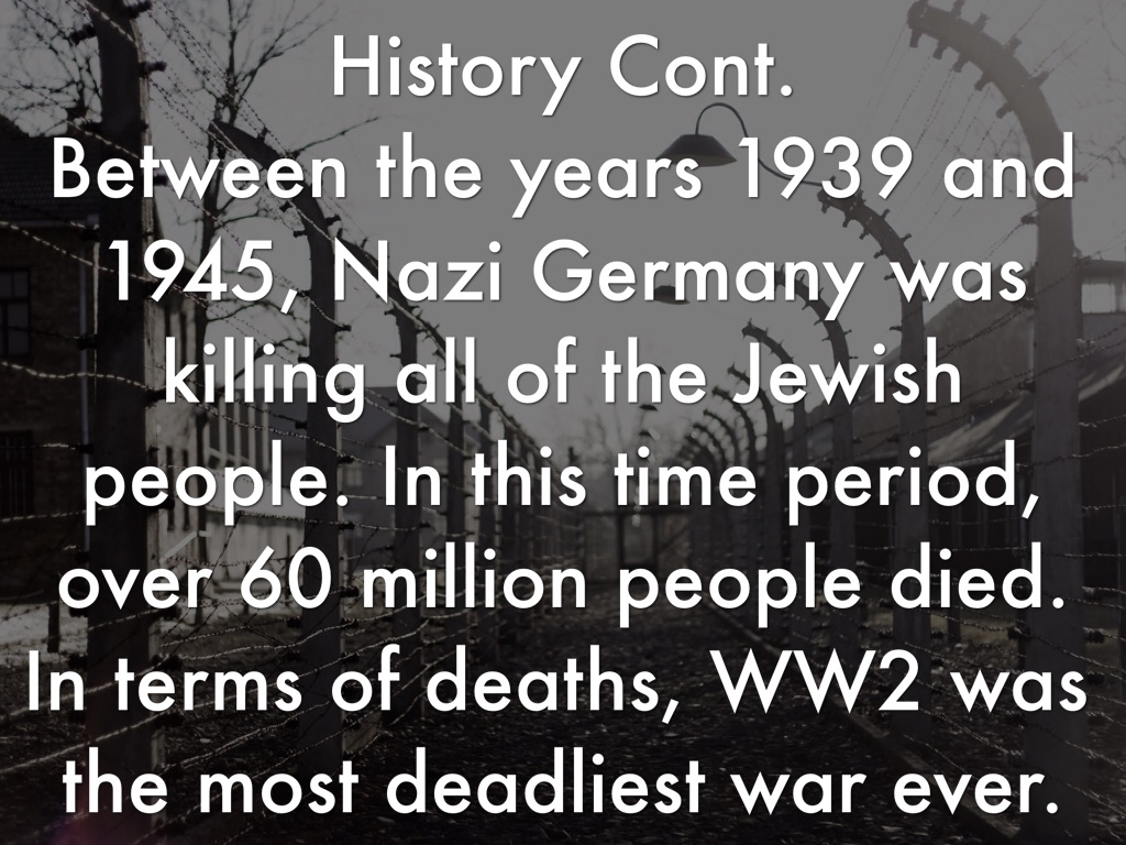 Between the years 1939 and 1945, Nazi Germany was killing all of the Jewish people. In this time period, over 60 million people died. In terms of deaths, WW2 was the most deadliest war ever.