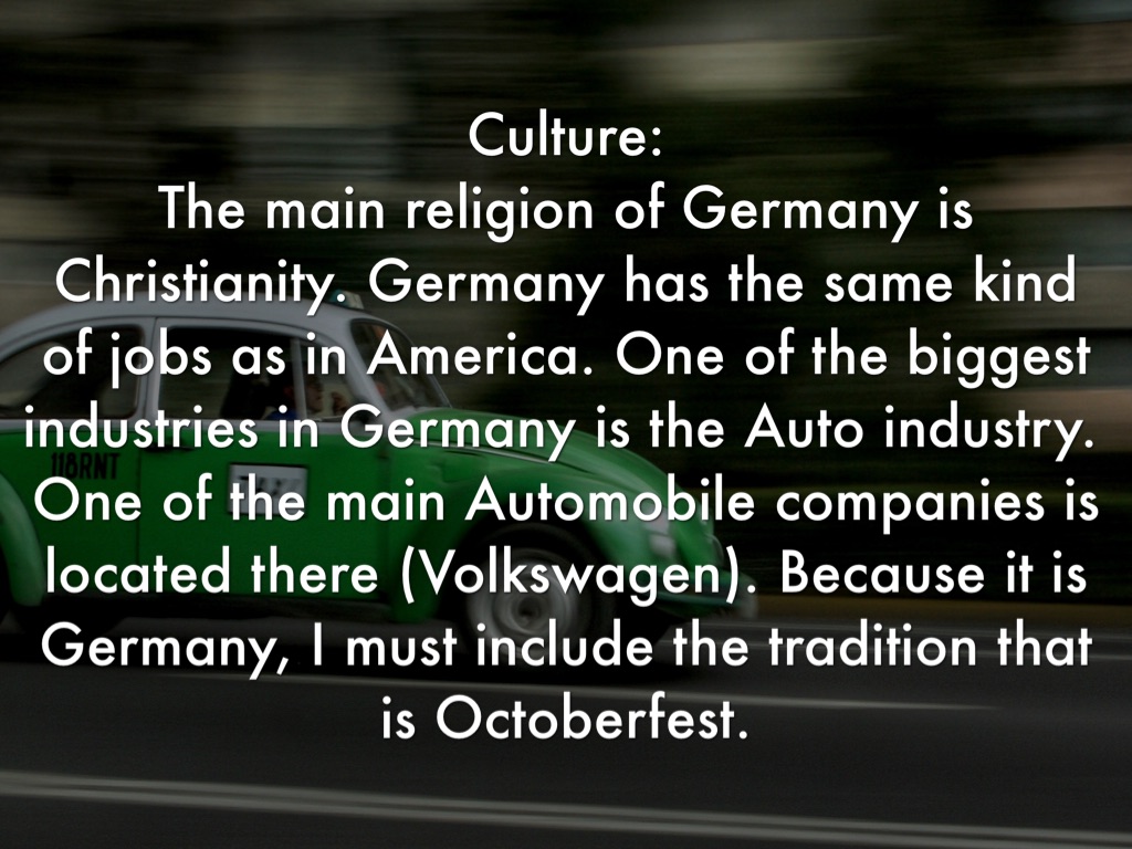 The main religion of Germany is Christianity. Germany has the same kind of jobs as in America. One of the biggest industries in Germany is the Auto industry. One of the main Automobile companies is located there (Volkswagen). Because it is Germany, I must include the tradition that is Octoberfest.