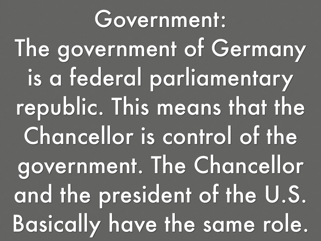 The government of Germany is a federal parliamentary republic. This means that the Chancellor is control of the government. The Chancellor and the president of the U.S. Basically have the same role.
