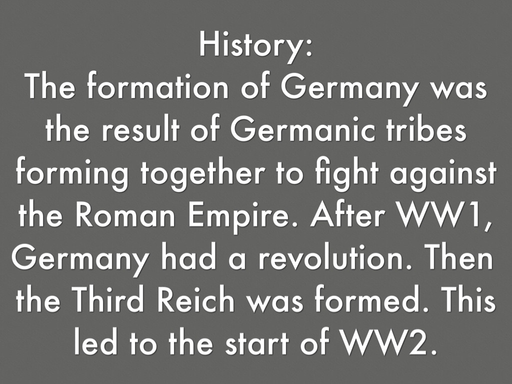 The formation of Germany was the result of Germanic tribes forming together to fight against the Roman Empire. After WW1, Germany had a revolution. Then the Third Reich was formed. This led to the start of WW2.