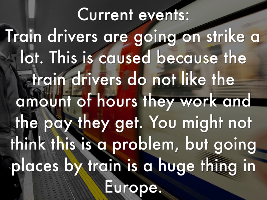 Train drivers are going on strike a lot. This is caused because the train drivers do not like the amount of hours they work and the pay they get. You might not think this is a problem, but going places by train is a huge thing in Europe.