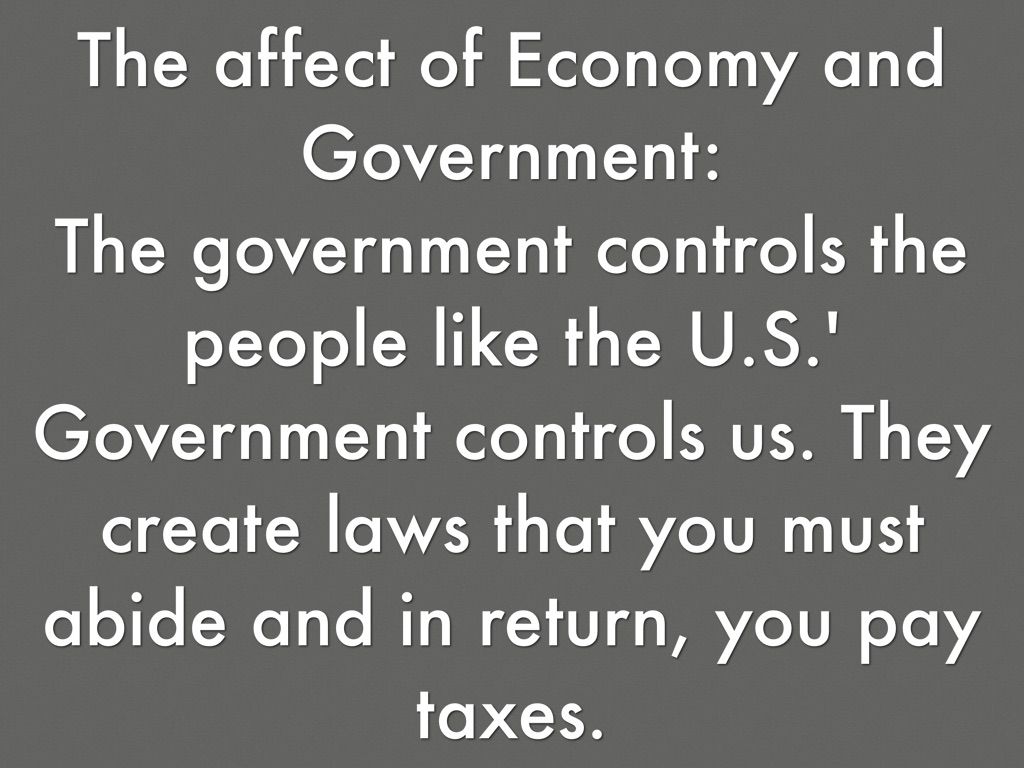 The government controls the people like the U.S.' Government controls us. They create laws that you must abide and in return, you pay taxes.
