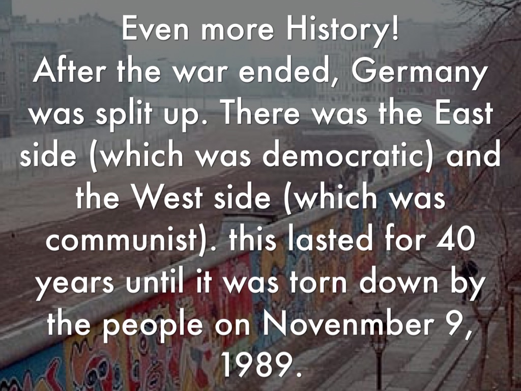 After the war ended, Germany was split up. There was the East side (which was democratic) and the West side (which was communist). this lasted for 40 years until it was torn down by the people on Novenmber 9, 1989.