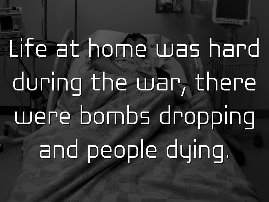 Life at home was hard during the war, there were bombs dropping and people dying.