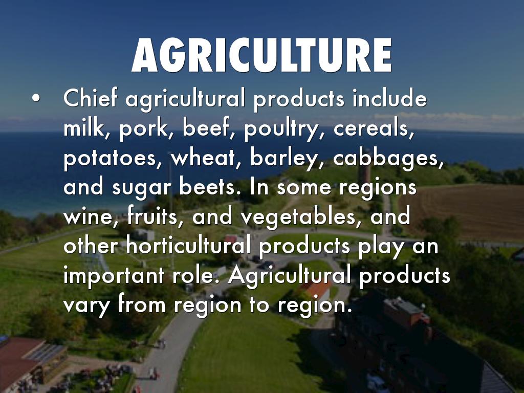 Chief agricultural products include milk, pork, beef, poultry, cereals, potatoes, wheat, barley, cabbages, and sugar beets. In some regions wine, fruits, and vegetables, and other horticultural products play an important role. Agricultural products vary from region to region.