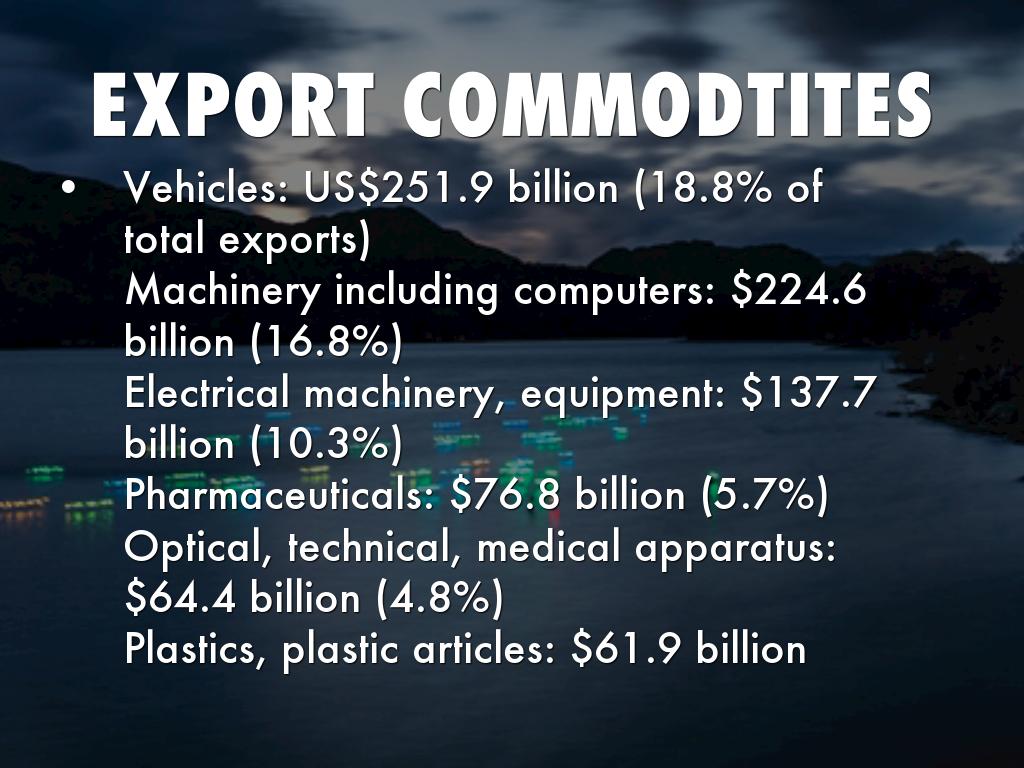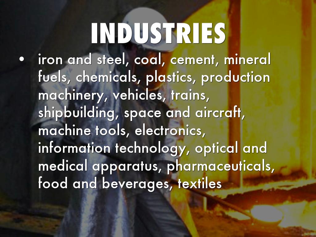 iron and steel, coal, cement, mineral fuels, chemicals, plastics, production machinery, vehicles, trains, shipbuilding, space and aircraft, machine tools, electronics, information technology, optical and medical apparatus, pharmaceuticals, food and beverages, textiles
