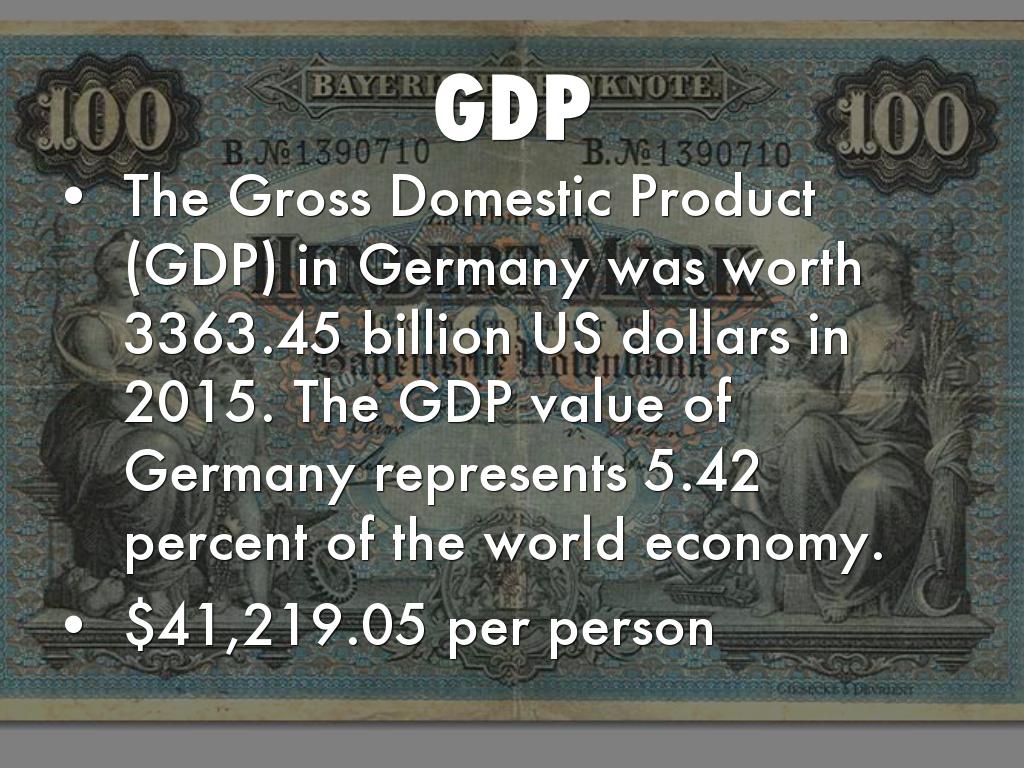 The Gross Domestic Product (GDP) in Germany was worth 3363.45 billion US dollars in 2015. The GDP value of Germany represents 5.42 percent of the world economy.