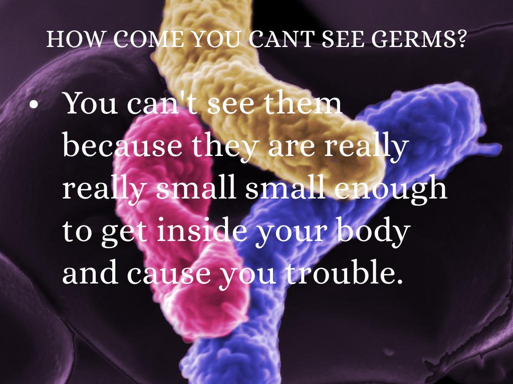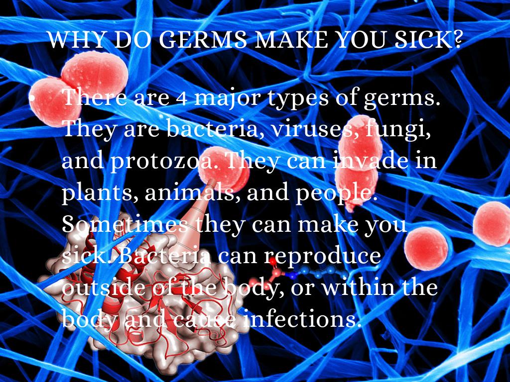 There are 4 major types of germs. They are bacteria, viruses, fungi, and protozoa. They can invade in plants, animals, and people. Sometimes they can make you sick. Bacteria can reproduce outside of the body, or within the body and cause infections.
