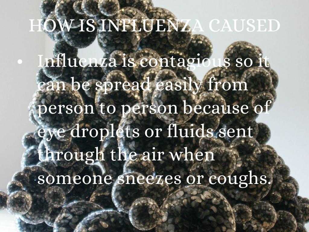 Influenza is contagious so it can be spread easily from person to person because of eye droplets or fluids sent through the air when someone sneezes or coughs.