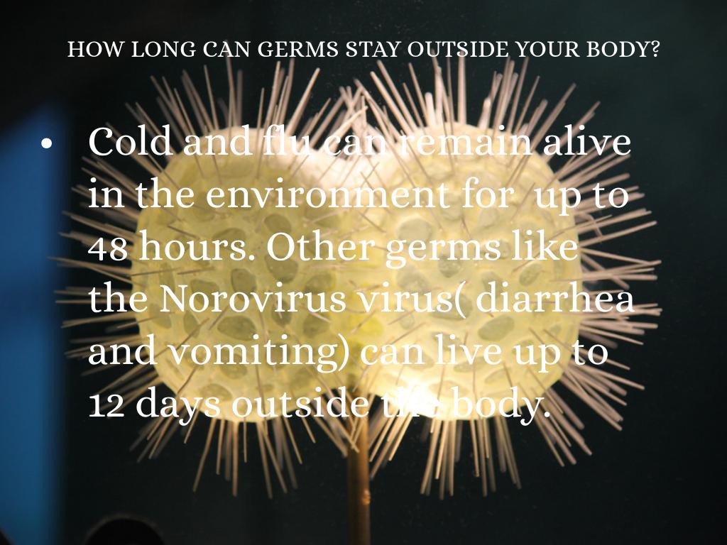Cold and flu can remain alive in the environment for up to 48 hours. Other germs like the Norovirus virus( diarrhea and vomiting) can live up to 12 days outside the body.